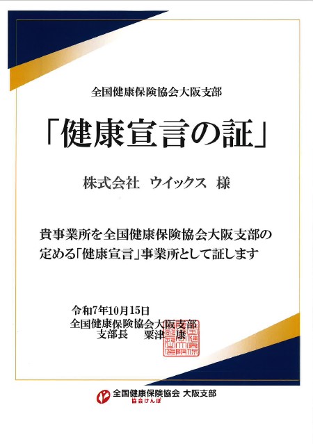 ㈱ウイックスは、従業員一人ひとりの健康を大切にし、いきいきと働ける職場づくりを目指しています。このたび、全国健康保険協会(協会けんぽ)大阪支部へ「健康宣言」を行い、「健康宣言の証」をいただきました。今後も、健康経営の推進を通じて社員の心身の健康維持と、より良い会社づくりに取り組んでまいります。